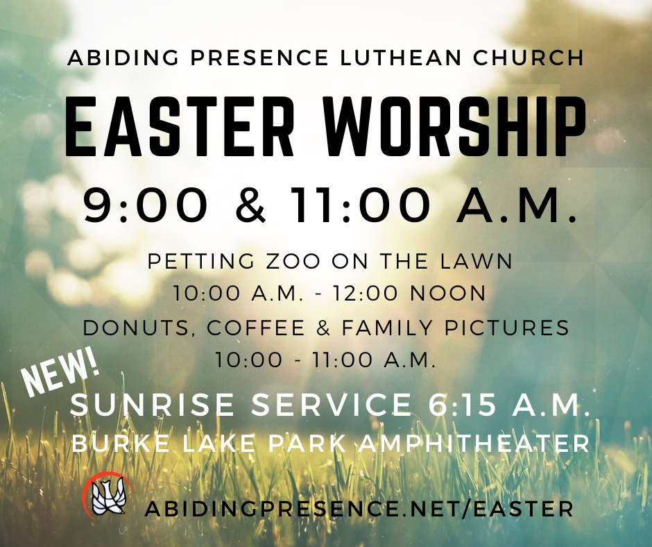 Easter Sunday at Abiding Presence will feature two identical worship services. Music will be led by a large music ensemble that includes choir, brass, strings, woodwinds, percussion, organ and piano. Our festival services will include a children’s moment with puppets, scripture, a sermon, prayers and Holy Communion.
