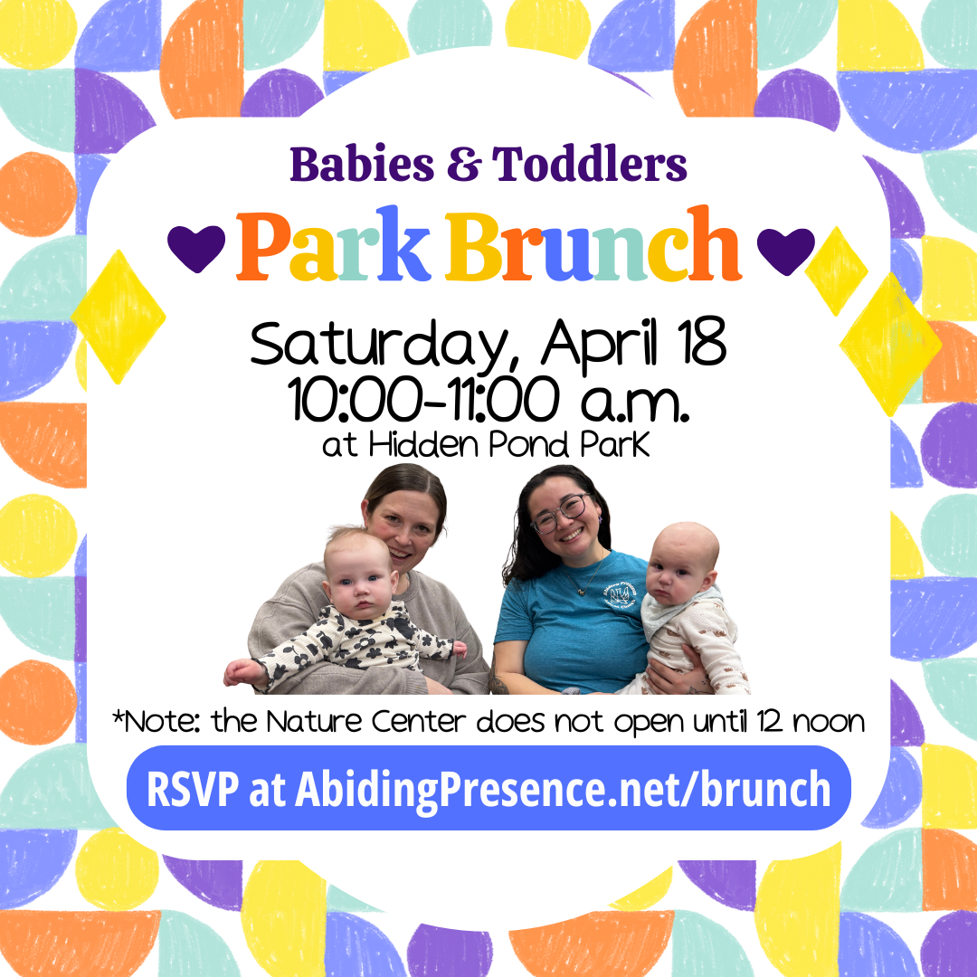 In April, we are adventuring to Hidden Pond Park. Join Ms. Michaela for a fun park date. We will have donuts, but this is going to be BYOC (bring your own coffee) for the morning! You can RSVP below for bruch. All are welcome, so bring a friend. If you have questions, you can reach out to our Children & Family Minister, Michaela Silvis.