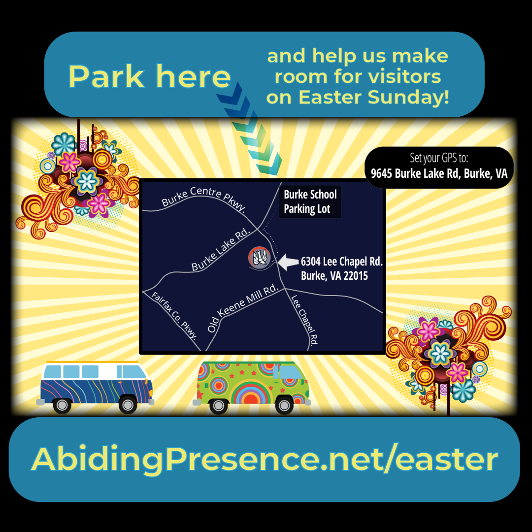 MEMBERS & REGULAR ATTENDERS: If you are able, please utilize our special Easter offsite parking at the Burke School parking lot to help welcome our guests!