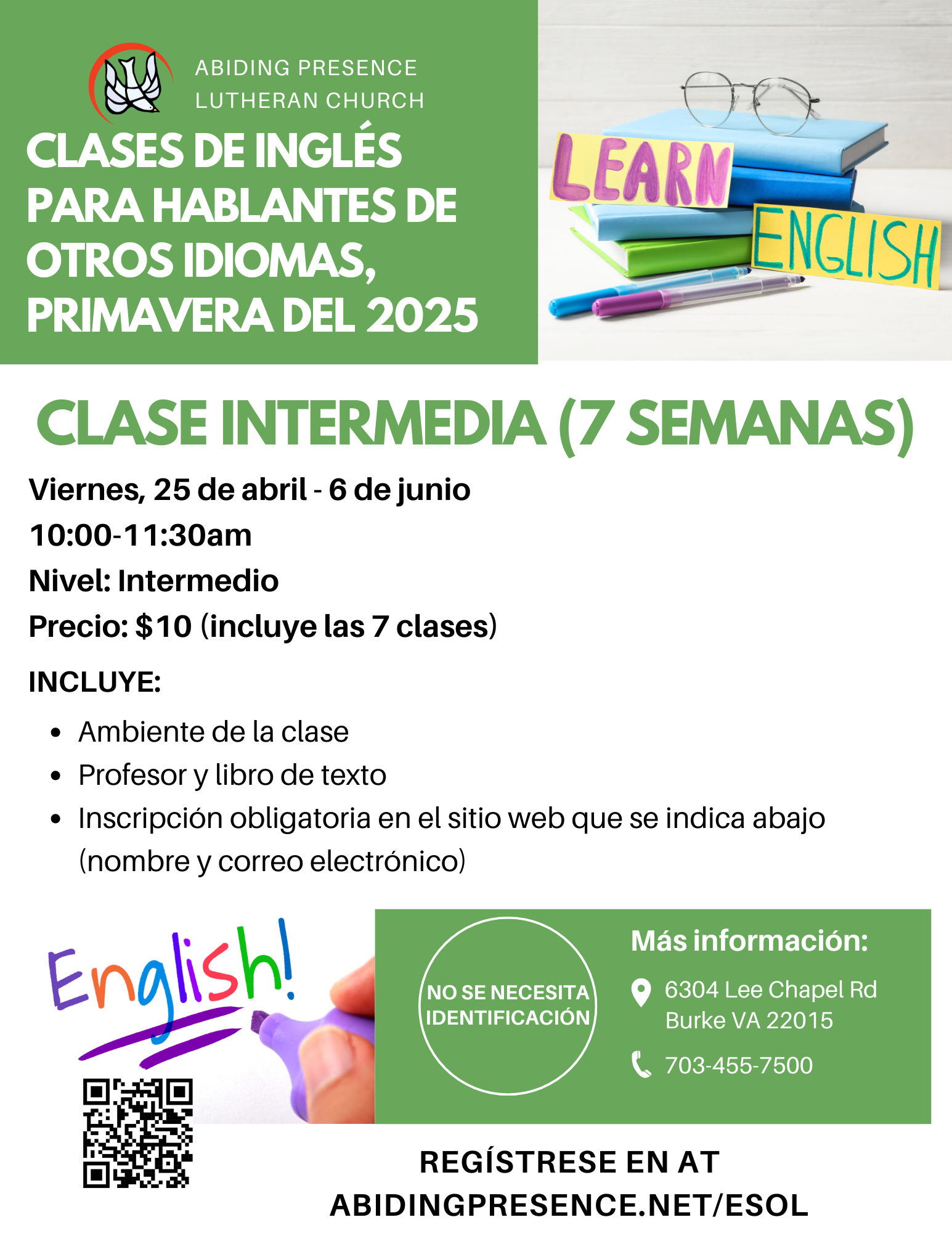 Esta clase está abierta a estudiantes de inglés de nivel intermedio. Nos reuniremos todos los viernes para trabajar en el aprendizaje o la mejora de las habilidades de habla inglesa. En este aula, en un entorno dirigido por el profesor, utilizarás un libro de texto con tareas semanales para hacer en casa. Es necesario inscribirse en el formulario que aparece a continuación.