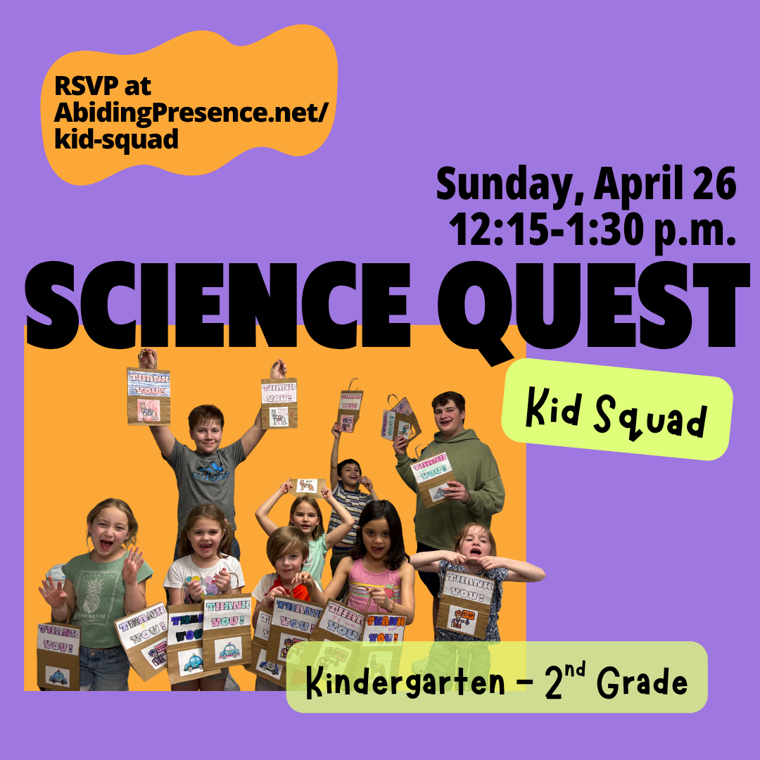 In April, we are going to break out our test tubes and lab coats as we take on a science quest hang out with our kindergarten, first and second grade students. Join Ms. Michaela for a pizza lunch following by some fun science activities. RSVP below to help us prepare.