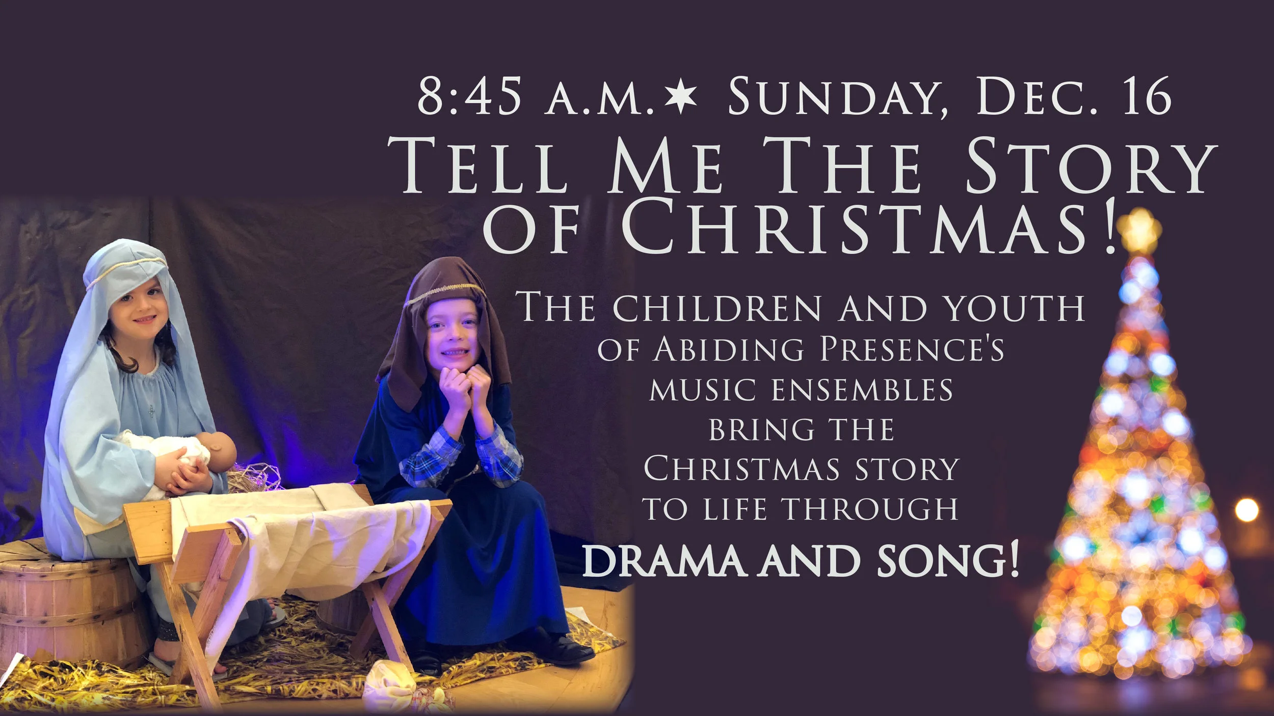 The children and youth of Abiding Presence's music ensembles will bring the Christmas story to life through drama and song. All are welcome at this special worship service that includes the singing of Christmas carols, the Christmas drama and Holy Communion. See the event page for more details.