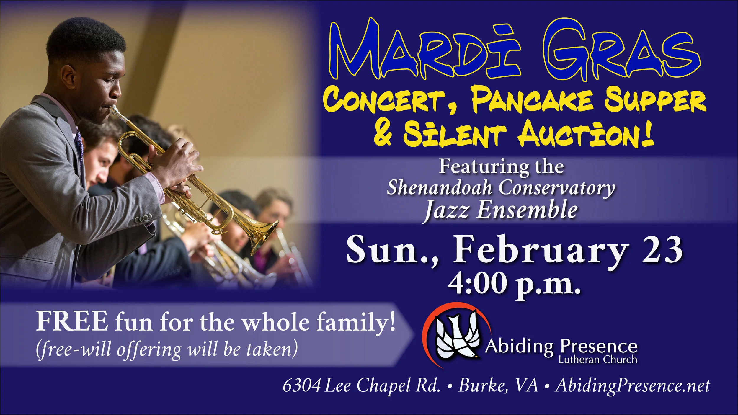 It’s an afternoon of toe-tapping tunes with the 20-piece Shenandoah Conservatory Jazz Ensemble under the direction of renowned jazz artist and educator Craig Fraedrich. Come experience the music of an authentic New Orleans Mardi Gras celebration! There will also be a Silent Auction and Pancake Dinner to benefit our Senior High Youth Summer Work Trip. A freewill donation will be collected for the concert and dinner.