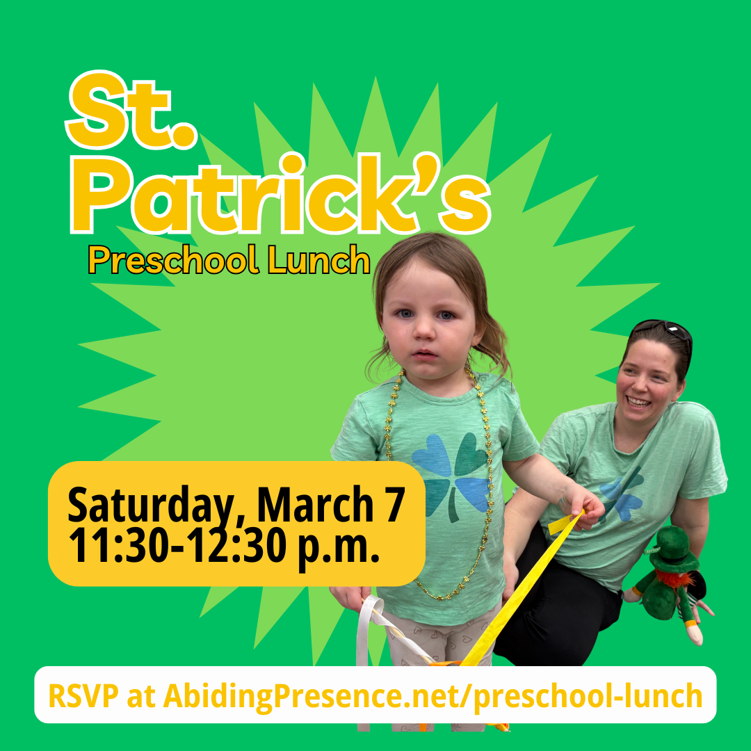 In March, we are having a St. Patrick’s lunch with our preschoolers. Join us for a pizza lunch, a lucky scavenger hunt and a great time to hangout with old and new friends!
