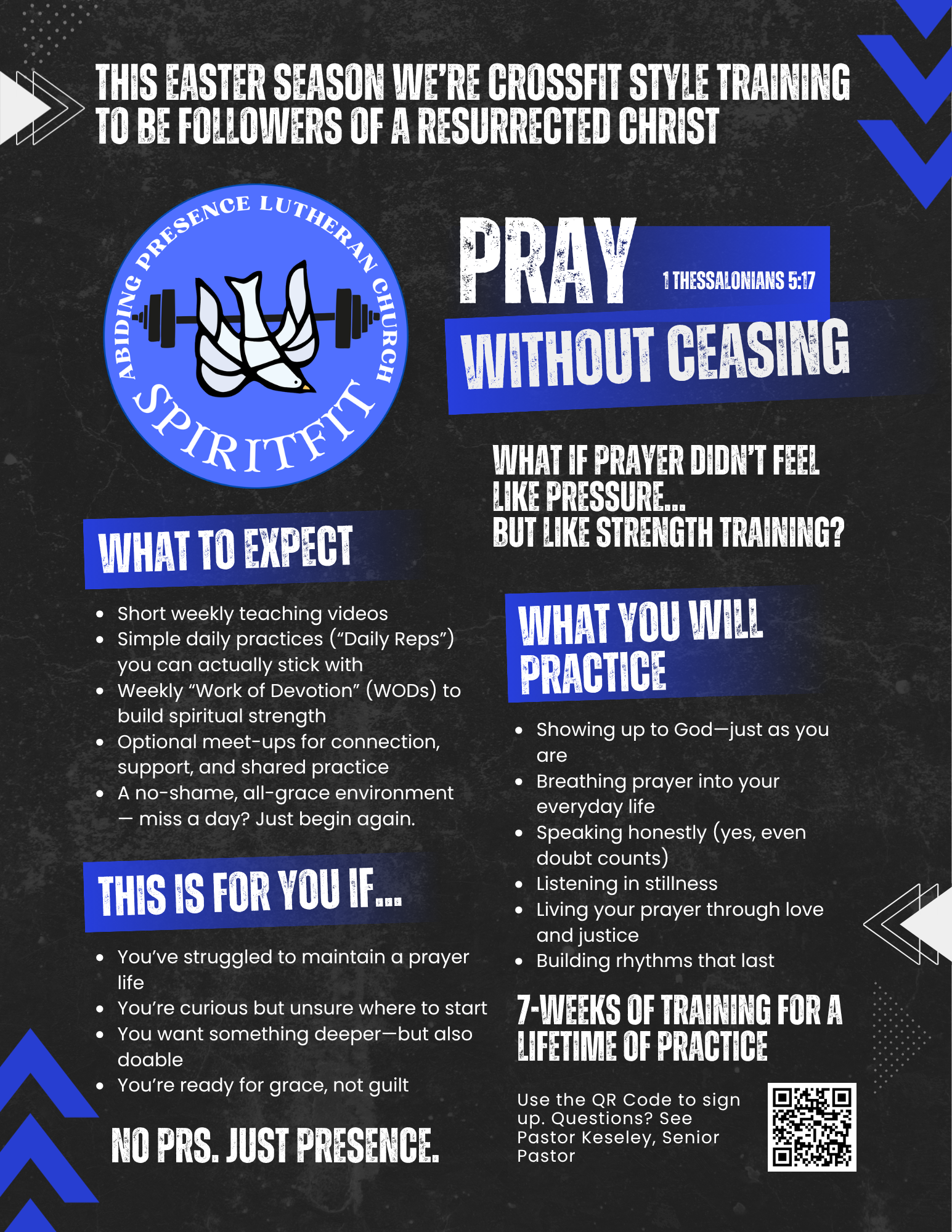 Great news! No real exercise required. You can do SpiritFit from a chaiPastor Keseley, Senior Pastor. So, don’t let that be an excuse that keeps you from participating.