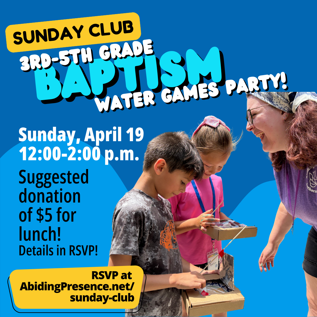 Join the Sunday Club this April for a Baptism water games party! We are going to have pizza, learn about baptism from Pastor Meredith, and play some fun water games. Anyone who would like to be baptized during this party can reach out to Michaela Silvis.